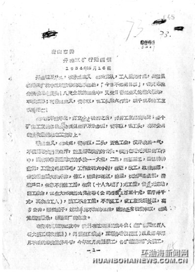 一份泛黃的行動綱領(lǐng)背后的故事 唐山市檔案館館藏《唐山市委開灤五礦行動綱領(lǐng)》!缎袆泳V領(lǐng)》中指出:在資本瘋狂的進攻中,我們有過光榮的戰(zhàn)斗史,這證明工人靠自己的力量,團結(jié)在自己的工會周圍,才能得 ...