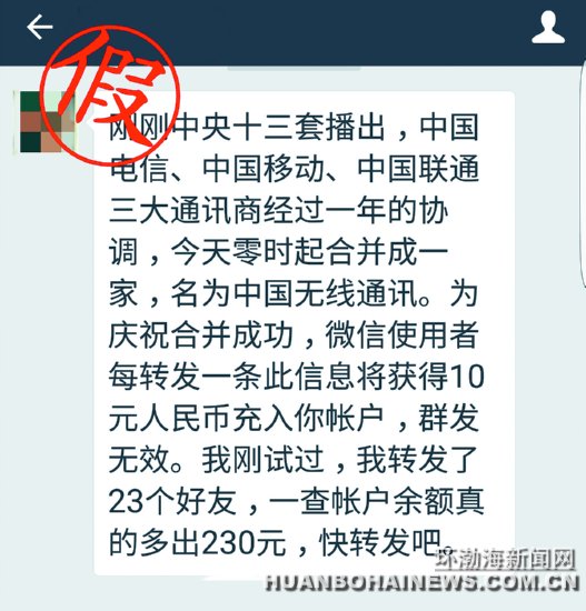 三大運(yùn)營(yíng)商合并發(fā)福利?假的! 環(huán)渤海新聞網(wǎng)消息 (記者 劉天玥)近日,市民秦女士撥打本報(bào)新聞熱線稱(chēng),最近不少朋友轉(zhuǎn)發(fā)一條“移動(dòng)、聯(lián)通以及電信合并發(fā)福利”的信息,大家轉(zhuǎn)發(fā)后卻并沒(méi)有獎(jiǎng)金到賬。經(jīng)記者核 ...