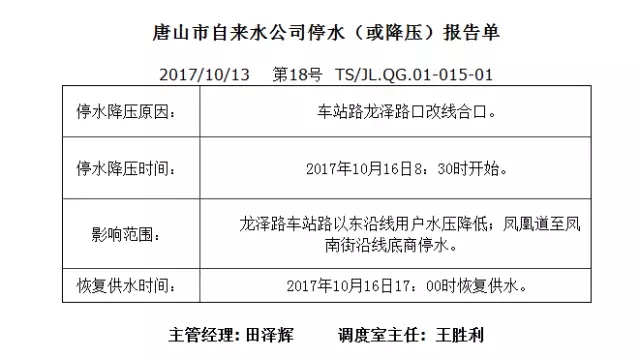 停水通知 為配合地下管廊施工,自來水公司定于2017年10月16日8:30—17:00時進(jìn)行車站路龍澤路口改線合口。屆時龍澤路車站路以東沿線用戶水壓降低;鳳凰道至鳳南街沿線底商停水。 望廣大用戶提前備水,遇雨 ...