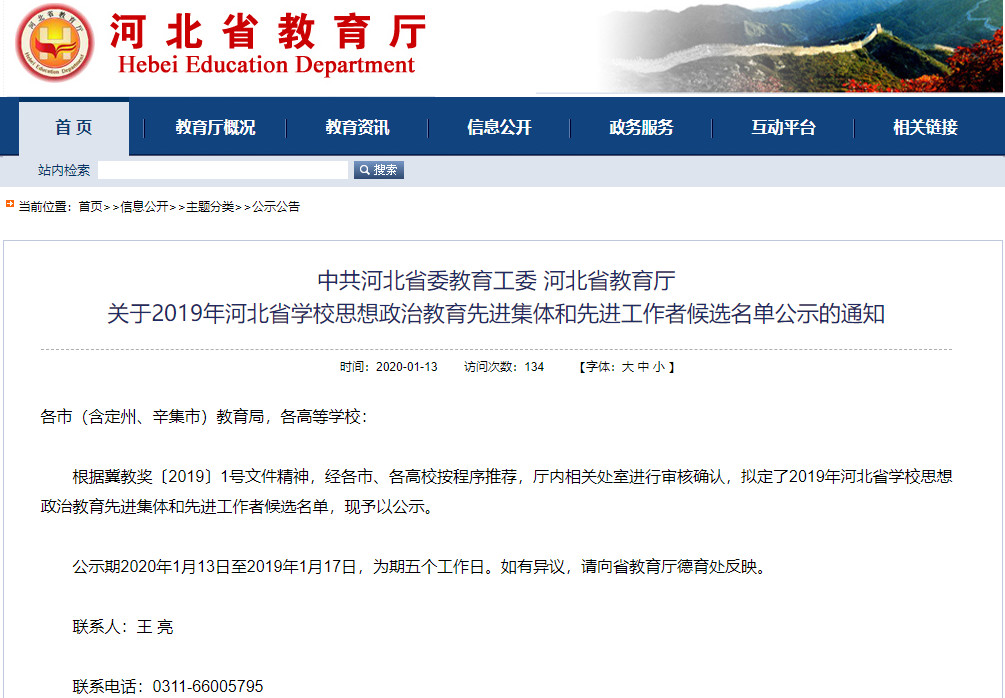 最新消息!中共河北省委教育工委、河北省教育廳發(fā)布通知,經(jīng)各市、各高校按程序推薦,廳內(nèi)相關(guān)處室進(jìn)行審核確認(rèn),擬定了2019年河北省學(xué)校思想政治教育先進(jìn)集體和先進(jìn)工作者候選名單,具體情況 2019年學(xué)校思政 ...