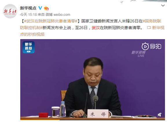 國家衛(wèi)健委新聞發(fā)言人米鋒26日在國務(wù)院聯(lián)防聯(lián)控機制新聞發(fā)布會上說,至26日,武漢在院新冠肺炎患者清零。 來源:新華視點微博