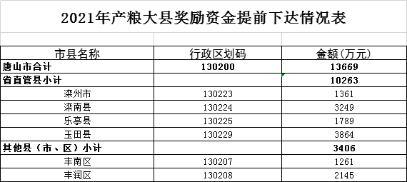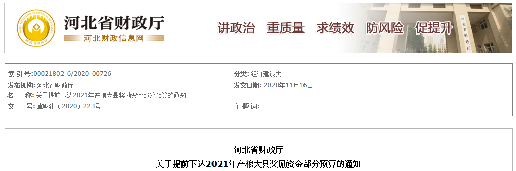 近日,省財政廳發(fā)布了《關(guān)于提前下達(dá)2021年產(chǎn)糧大縣獎勵資金部分預(yù)算的通知》,我省80個產(chǎn)糧大縣將獲得21.2543億元獎勵資金。 《通知》要求,設(shè)區(qū)市財 ...
