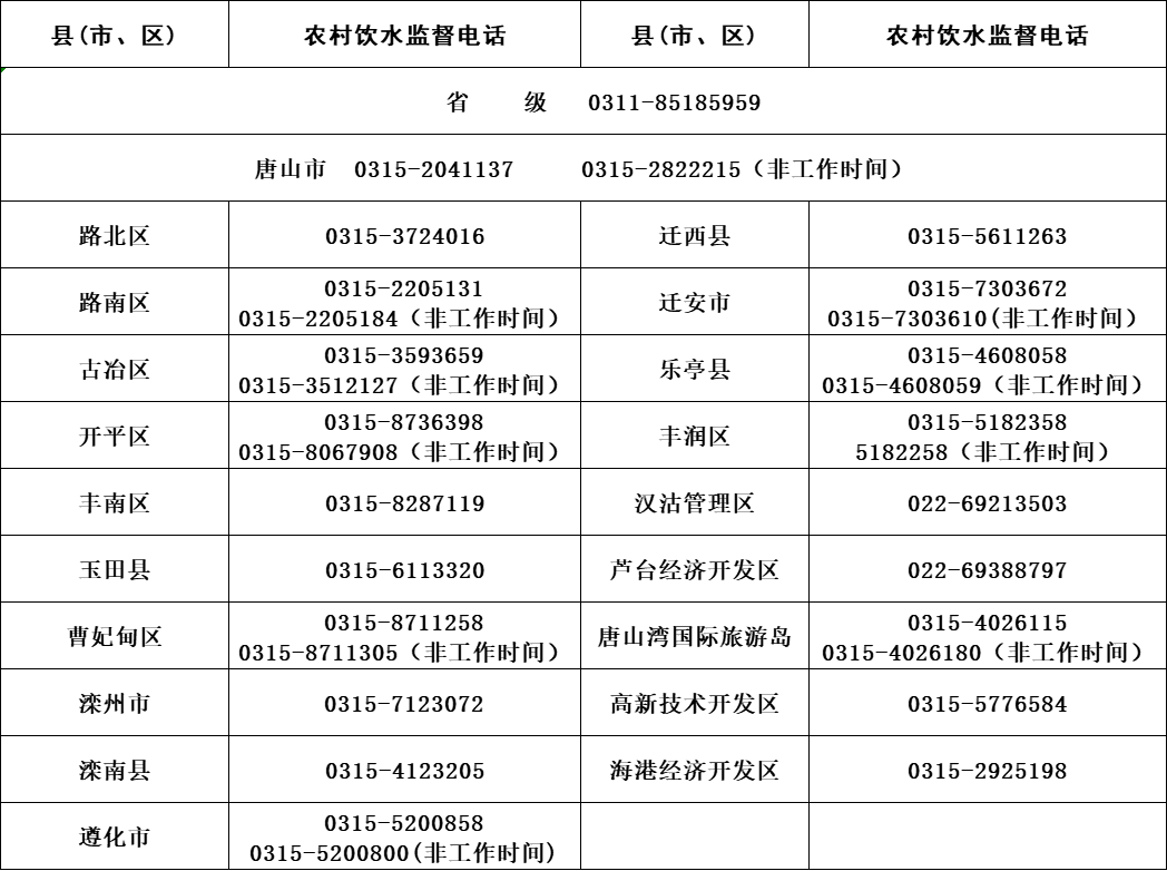 河北省各市縣農(nóng)村飲水監(jiān)督電話表(唐山)