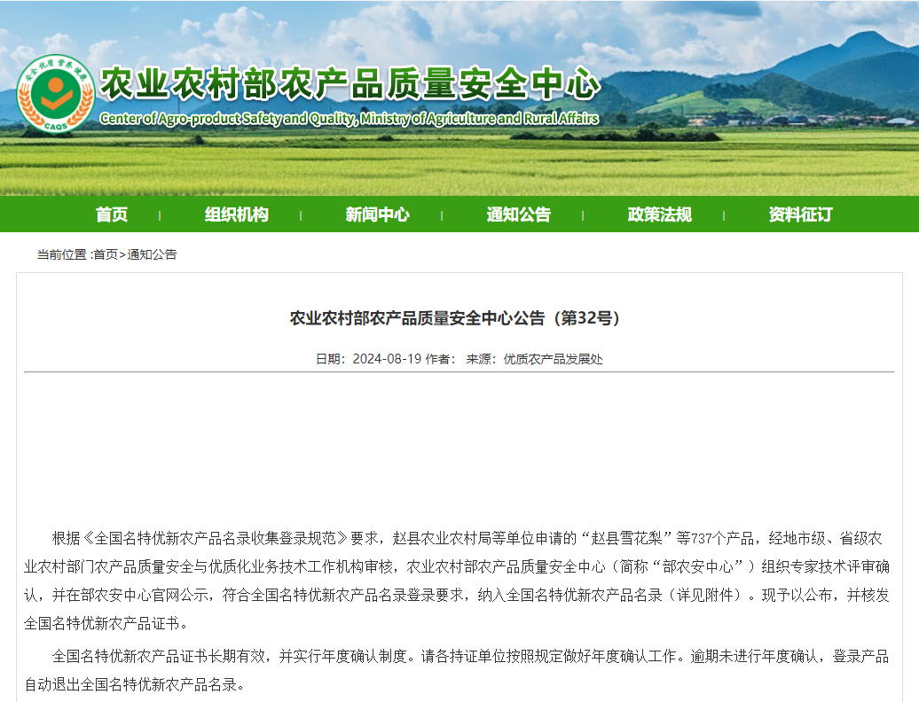 近日,農(nóng)業(yè)農(nóng)村部農(nóng)產(chǎn)品質(zhì)量安全中心公布了“2024年第二批全國名特優(yōu)新農(nóng)產(chǎn)品名錄”。全國共有737個產(chǎn)品入選,其中唐山4個農(nóng)產(chǎn)品上榜。詳情如下:農(nóng)業(yè)農(nóng)村部農(nóng)產(chǎn)品質(zhì)量安全中心公告(第32號)根據(jù)《全國名特優(yōu)新農(nóng)產(chǎn) ...